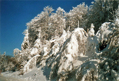 Bild links: Langlauf-Loipe im tief verschneiten Wald